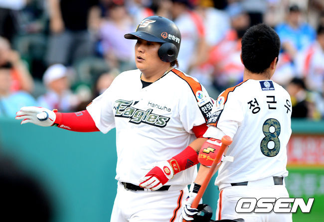 5회말 2사 2루에서 한화 김태균이 투런포를 날리고 정근우의 축하를 받고 있다.