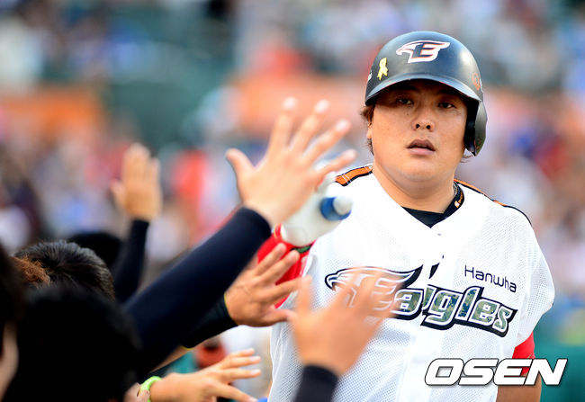 5회말 2사 2루에서 한화 김태균이 투런포를 날리고 더그아웃에서 동료선수들과 하이파이브를 하고 있다.