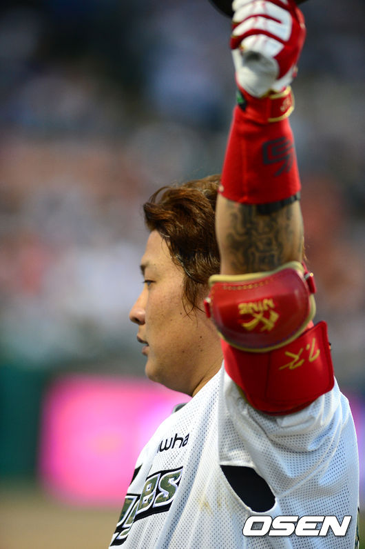 7회말 2사에서 한화 김태균이 솔로포를 날리고 팬들에 인사를 하고 있다.