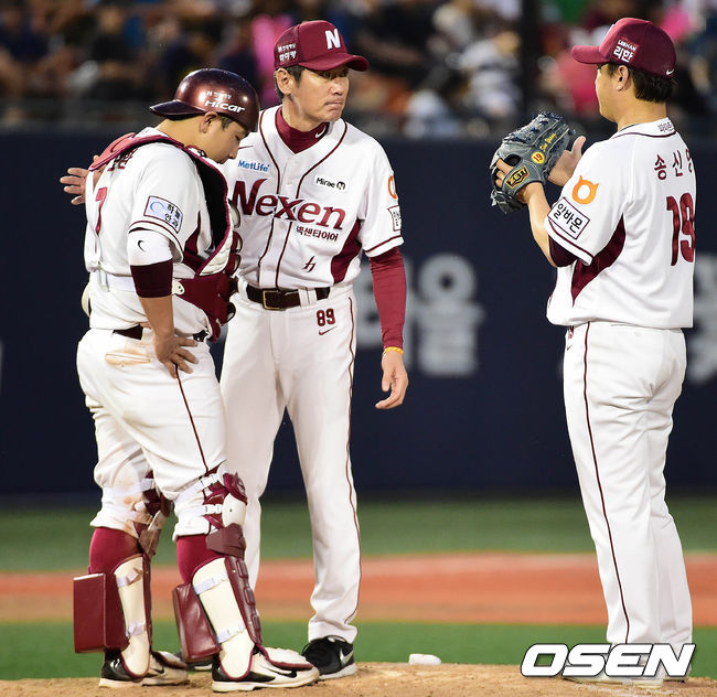 7회초 두산 공격 1사 만루 상황 넥센 이강철 코치가 마운드에 올라 투수 송신영, 포수 허도환과 대화를 나누고 있다.