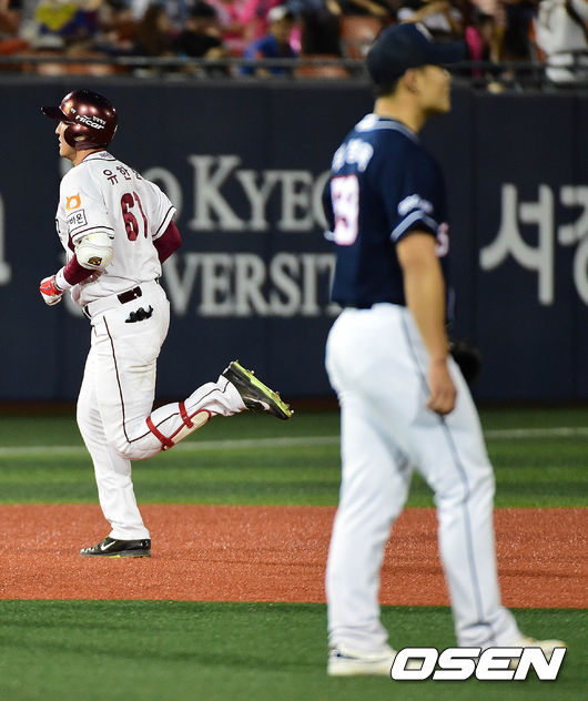 7회말 넥센 공격 1사 주자없는 상황 유한준이 두산 투수 최병욱을 상대로 우중간 솔로포를 날리고 그라운드를 돌고 있다.