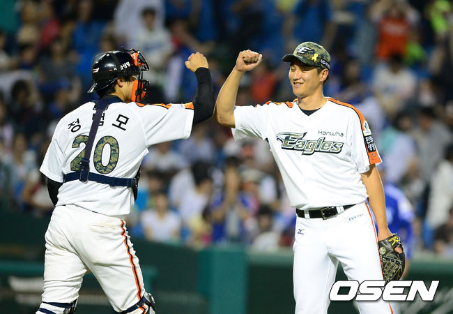 경기후 한화 정범모, 윤규진이 승리 하이파이브를 하고 있다./jpnews@osen.co.kr