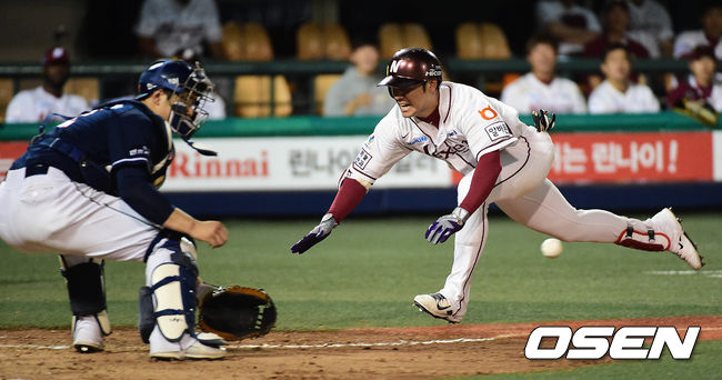 8회말 넥센 공격 선두타자로 나선 문우람이 우측 펜스를 맞히는 3루타를 날리고 홈까지 쇄도했지만 두산 포수 김재환의 태그에 걸려 아웃됐다. 홈으로 슬라이딩을 시도하는 문우람.