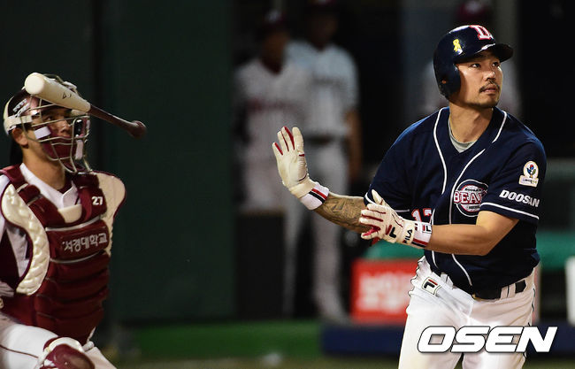 9회초 두산 공격 1사 1, 2루 상황 오재원이 추격의 좌월 스리런포를 날리고 있다.