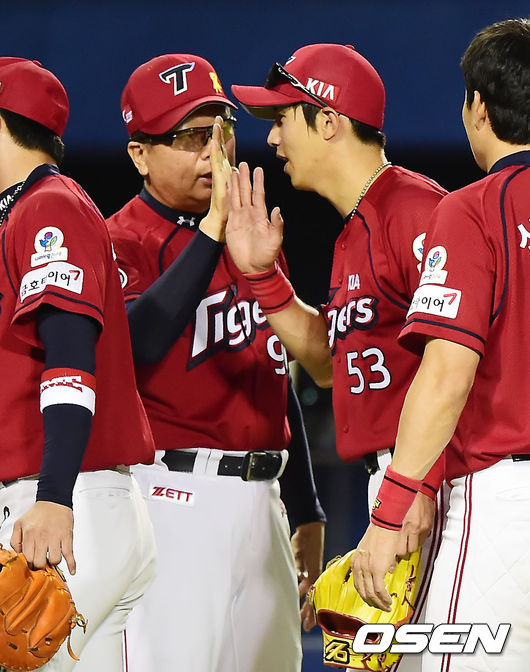 경기를 마치고 KIA 선동렬 감독과 이대형이 하이파이브를 하고 있다. / rumi@osen.co.kr