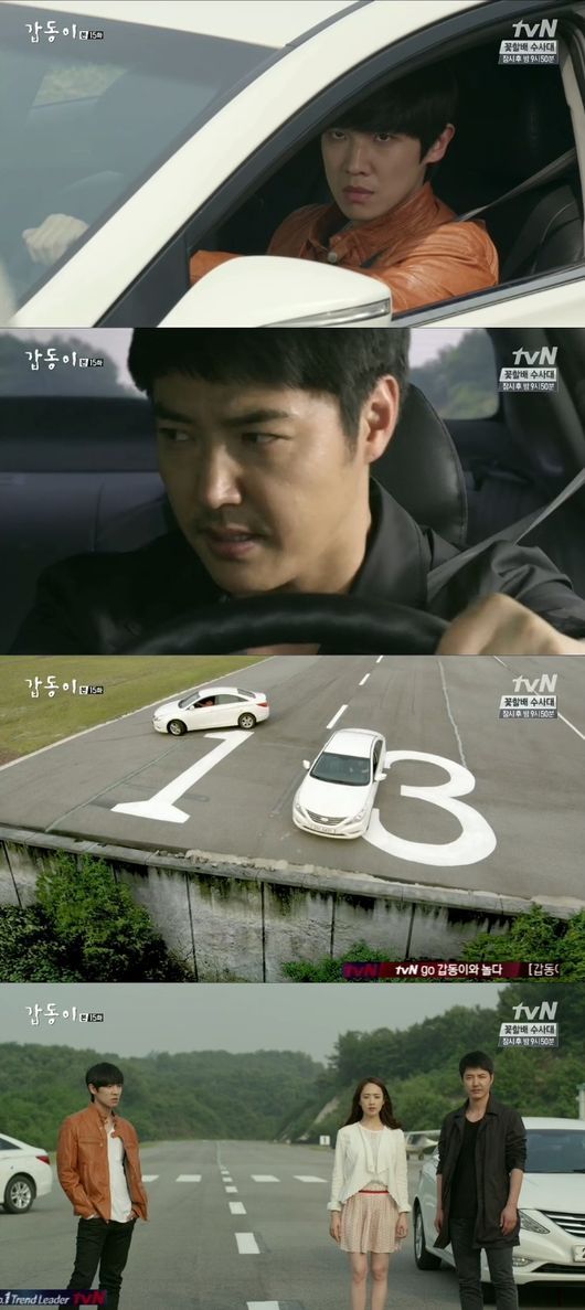 6일 오후 방송된 tvN 금토드라마 ‘갑동이’ 15회에는 류태오(이준 분)를 조력자로 끌어들이고자 치킨레이스를 제안하는 하무염(윤상현 분)의 모습이 그려졌다. 두 사람은 절벽을 향해 차를 타고 달렸고, 먼저 핸들을 꺾은 태오가 패배했다.