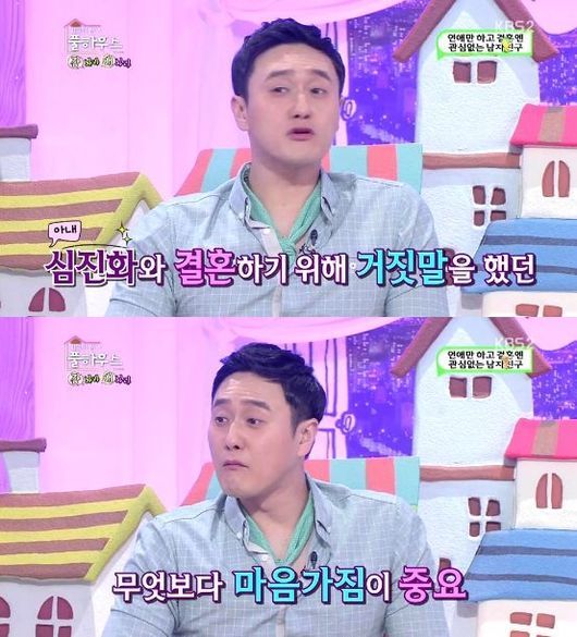 이어 "천만원 있는데, 심진화에게 1억이 있다고 거짓말 했다"며 "결혼하고 싶은 여자가 있으면 이렇게라도 사기를 쳐야 한다"고 해 웃음을 자아냈다.
