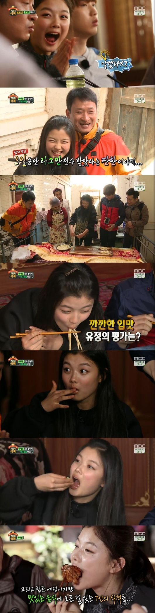 김유정은 6일 오후 방송된 MBC 예능프로그램 '7인의 식객'에서 서경석, 남상일, B1A4 산들이 속한 테마팀의 일원으로 국수의 기원지인 중국 투루판을 찾았다.