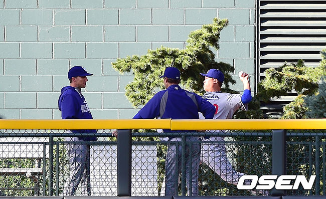 6일(한국시간) 미국 콜로라도주 덴버 쿠어스필드에서 열리는 '2014 메이저리그' 미국 메이저리그 콜로라도 로키스와 LA 다저스의 경기에 앞서 류현진이 불펜에게 몸을 풀고 있다.