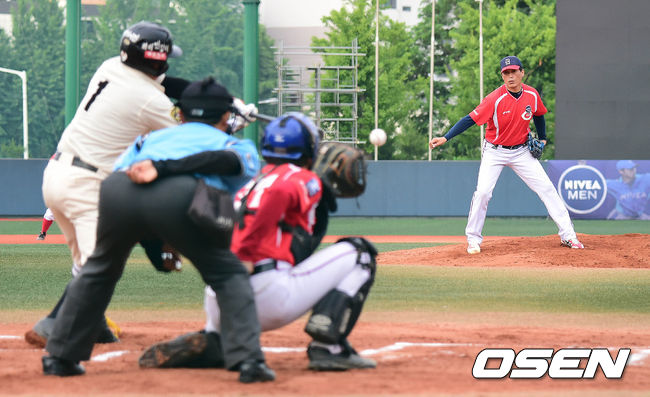 1회말 조마조마 공격, 텐탈코마스 선발 임승태가 힘차게 공을 뿌리고 있다.