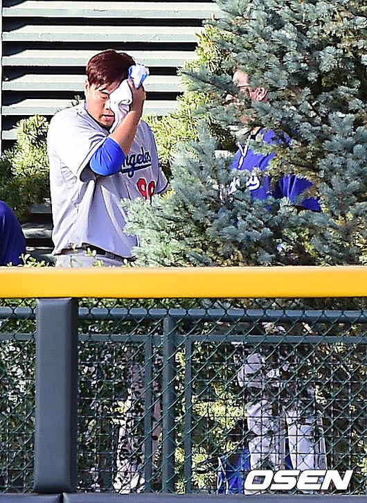 6일(한국시간) 미국 콜로라도주 덴버 쿠어스필드에서 열리는 '2014 메이저리그' 미국 메이저리그 콜로라도 로키스와 LA 다저스의 경기에 앞서 류현진이 불펜을 마친 뒤 땀을 닦고 있다.