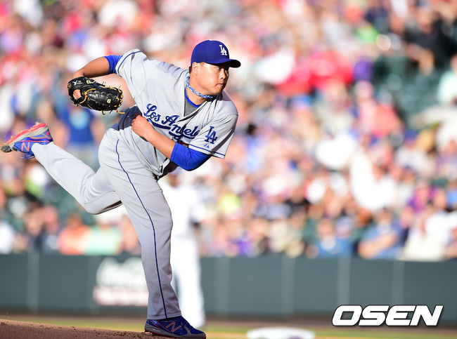 6일(한국시간) 미국 콜로라도주 덴버 쿠어스필드에서 '2014 메이저리그' 미국 메이저리그 콜로라도 로키스와 LA 다저스의 경기, 류현진이 힘차게 공을 던지고 있다.