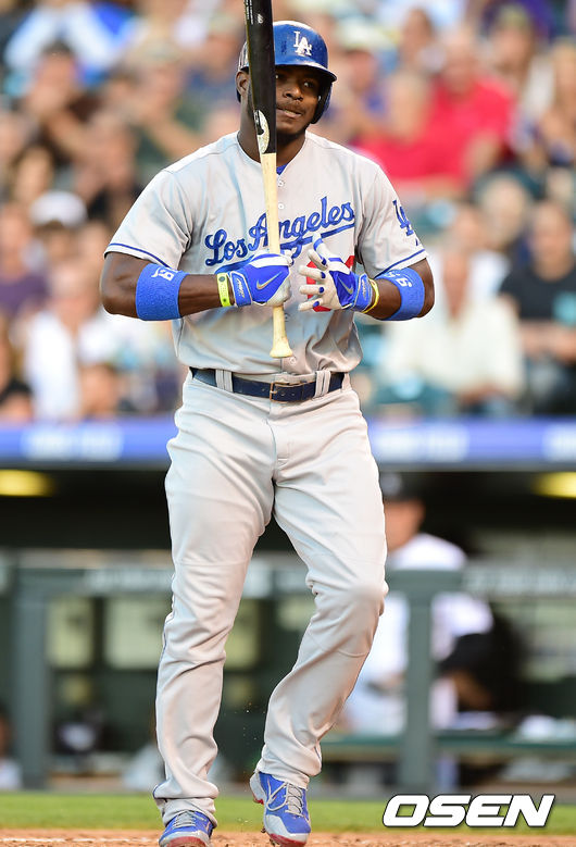 6일(한국시간) 미국 콜로라도주 덴버 쿠어스필드에서 '2014 메이저리그' 미국 메이저리그 콜로라도 로키스와 LA 다저스의 경기, 3회말 2사 2루 삼진을 당한 푸이그가 아쉬워 하고 있다.