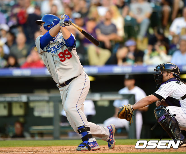6일(한국시간) 미국 콜로라도주 덴버 쿠어스필드에서 '2014 메이저리그' 미국 메이저리그 콜로라도 로키스와 LA 다저스의 경기, 류현진이 5회초 선두타자로 나와 2루타를 치고 있다.