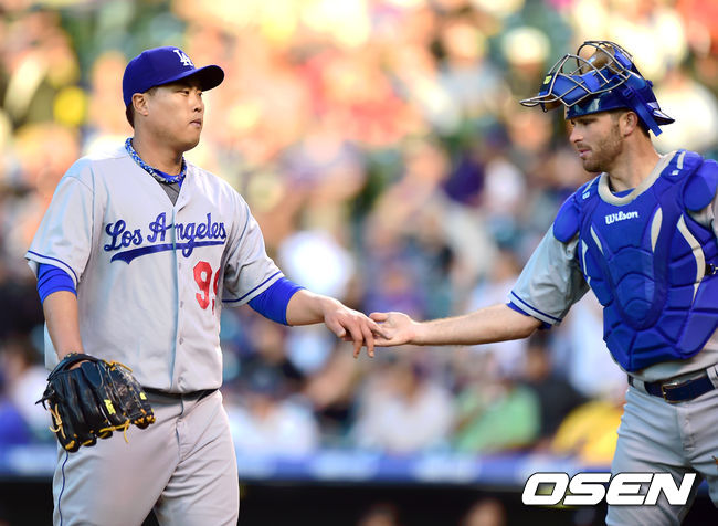 6일(한국시간) 미국 콜로라도주 덴버 쿠어스필드에서 '2014 메이저리그' 미국 메이저리그 콜로라도 로키스와 LA 다저스의 경기, 류현진이 4회말 무사 1,2루 위기를 넘기고 부테라와 손바닥을 마주치고 있다.