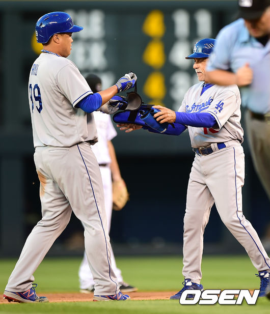 6일(한국시간) 미국 콜로라도주 덴버 쿠어스필드에서 '2014 메이저리그' 미국 메이저리그 콜로라도 로키스와 LA 다저스의 경기, 류현진이 2루타를 치고 주루코치에게 장비를 건네고 있다.