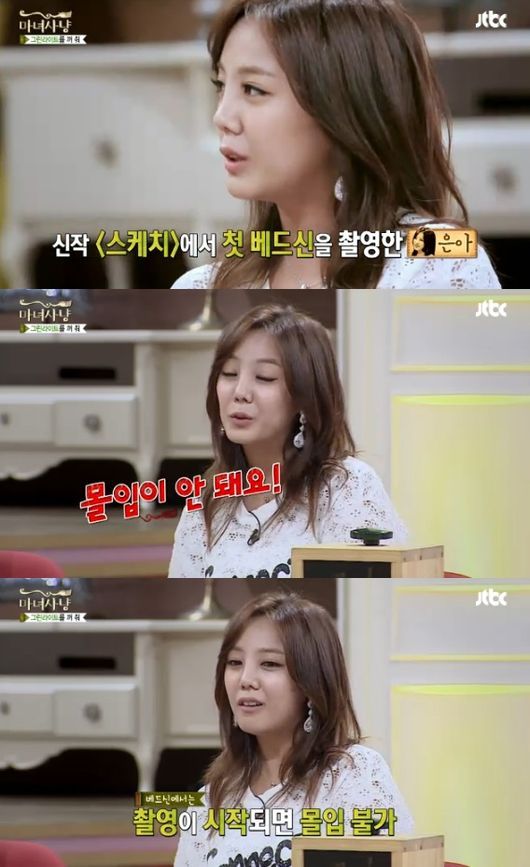 이날 고은아는 MC들과 앞서 1부 ‘너의 곡소리가 들려’의 성인영화 배우 남자친구에 대한 여자친구의 사연에 대해 이야기하던 중 “최근 ‘스케치’라는 영화를 찍었는데 첫 노출이 있었고, 첫 베드신이 있었다”라고 말했다.