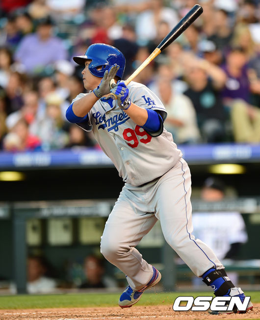 6일(한국시간) 미국 콜로라도주 덴버 쿠어스필드에서 '2014 메이저리그' 미국 메이저리그 콜로라도 로키스와 LA 다저스의 경기, 류현진이 5회초 선두타자로 나와 2루타를 치고 있다.