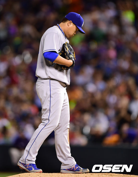 6일(한국시간) 미국 콜로라도주 덴버 쿠어스필드에서 '2014 메이저리그' 미국 메이저리그 콜로라도 로키스와 LA 다저스의 경기, 류현진이 6회말 홈런 포함 2실점 한 류현진이 고개를 숙이고 있다.