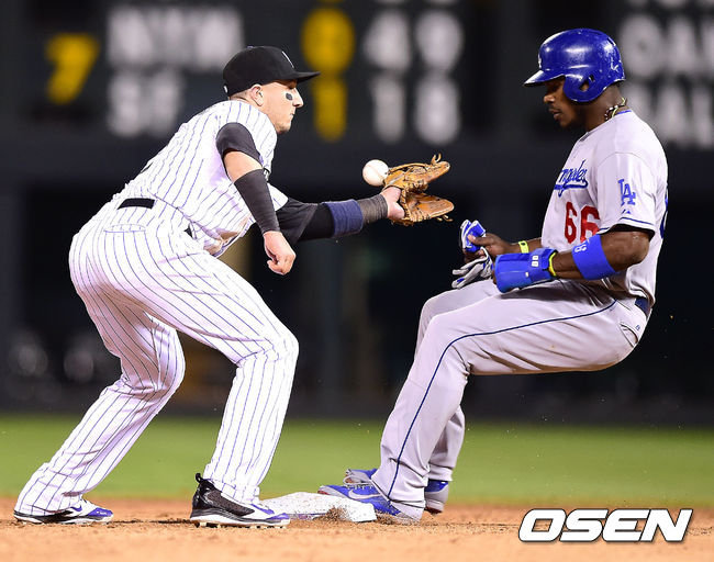 9회초 무사 1루 LA 다저스 푸이그가 2루 도르를 시도하다 콜로라도 포수 마이클 맥켄리의 송구 실책으로 3루까지 진루 했다./youngrae@osen.co.kr