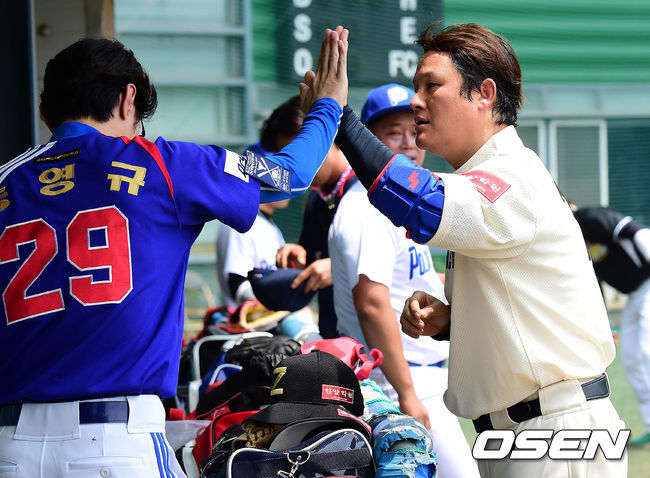 2회초 연예인올스타 공격 1사 2, 3루 상황 김인수의 2타점 2루타때 홈을 밟은 강성진이 더그아웃 동료들과 인사를 나누고 있다.