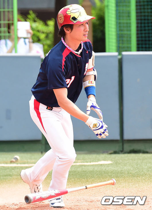 2회초 연예인올스타 공격 선두타자로 나선 이재수가 우전안타를 날리고 있다.