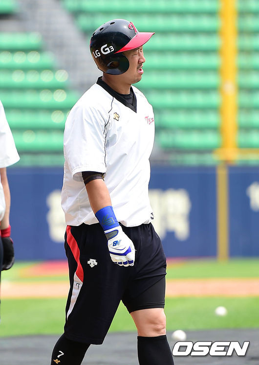 경기에 앞서 LG 이병규가 타격 훈련을 마치고 케이지를 나가고 있다.