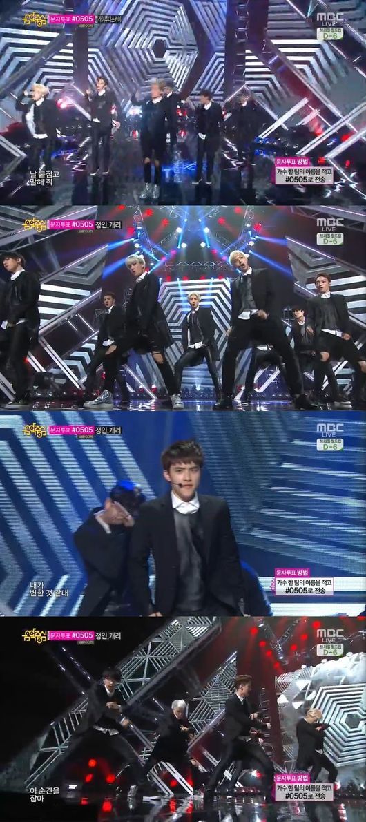 엑소는 7일 오후 방송된 MBC '쇼!음악중심'에서 엑소K의 '중독'을 엑소K-엑소M의 완전체 무대로 선보였다.