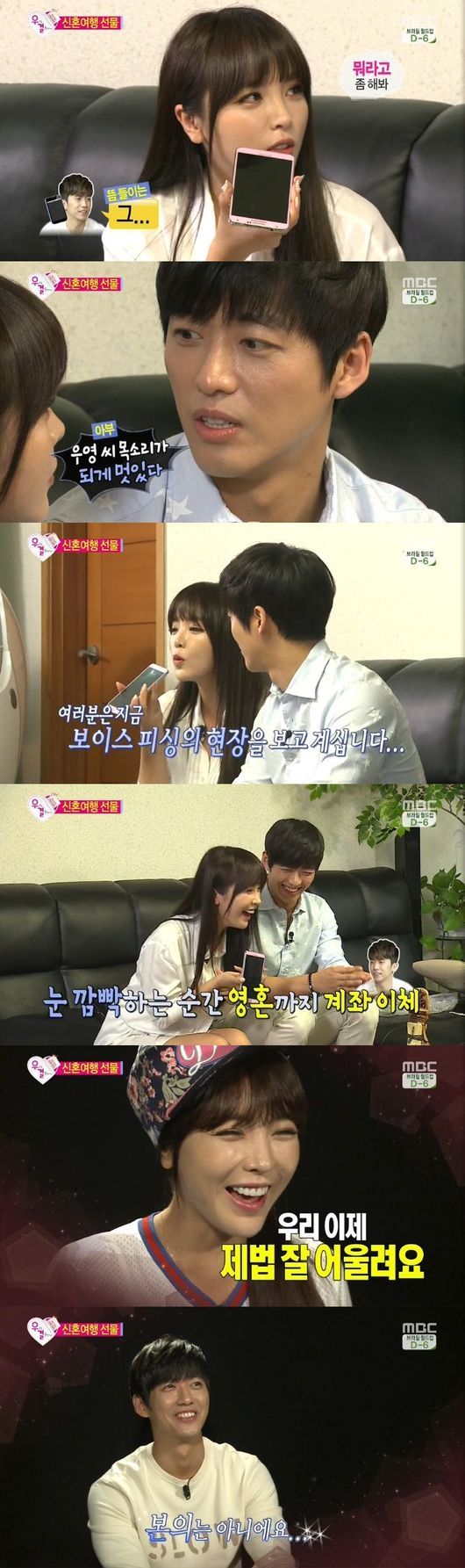 남궁민과 홍진영은 7일 오후 방송된 MBC 예능프로그램 '우리 결혼했어요 시즌4'(이하 '우결')에서 우영과 세영 커플이 신혼여행지에서 보낸 우산 선물을 받고 탐탁치 않은 듯한 표정을 지었다.