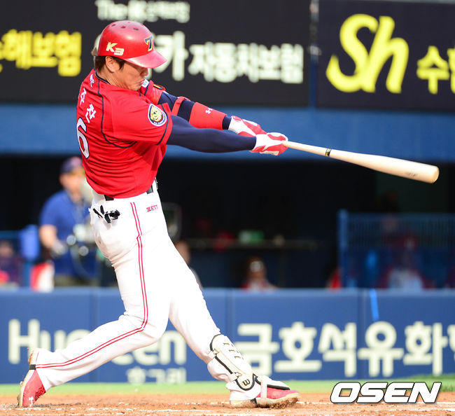 2회초 2사 1루에서 KIA 김주찬이 좌월 투런 홈런을 치고 있다.