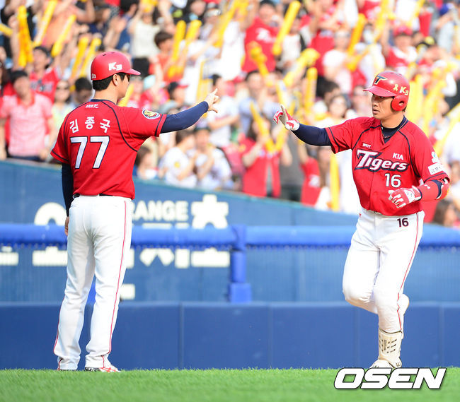 2회초 2사 1루에서 KIA 김주찬이 좌월 투런 홈런을 치고 김종국 코치와 아이파이브를 하고 있다.