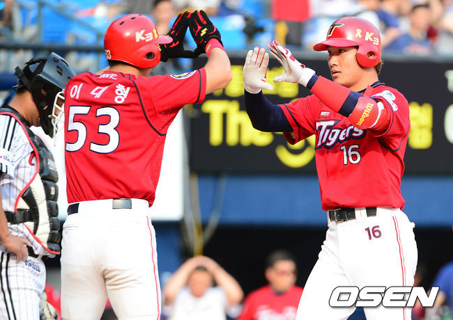 2회초 2사 1루에서 KIA 김주찬이 좌월 투런 홈런을 치고 홈을 밟은 선행주자 이대형과 하이파이브를 하고 있다.