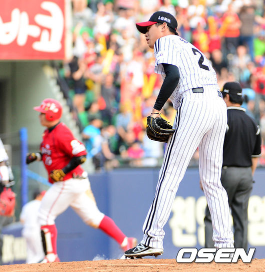 4회초 2사 2루에서 KIA 나지완에게 좌월 투런 홈런을 허용한 LG 임정우가 아쉬운 표정을 짓고 있다.