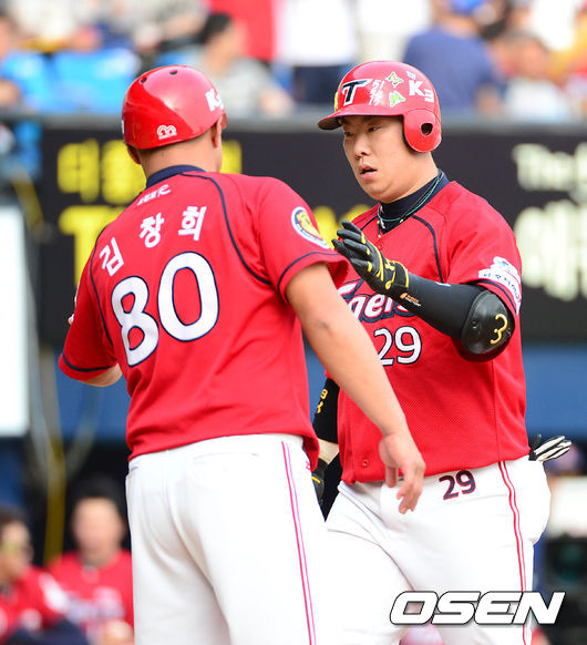 4회초 2사 2루에서 KIA 나지완이 좌월 투런 홈런을 치고 김창희 코치와 하이파이브를 하고 있다.