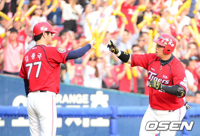4회초 2사 2루에서 KIA 나지완이 좌월 투런 홈런을 치고 김종국 코치와 하이파이브를 하고 있다.