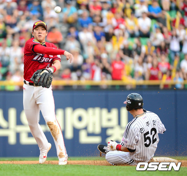 5회말 1사 1루에서 KIA 안치홍이 LG 박경수 땅볼때 1루주자 손주인을 포스아웃 처리하고 있다.