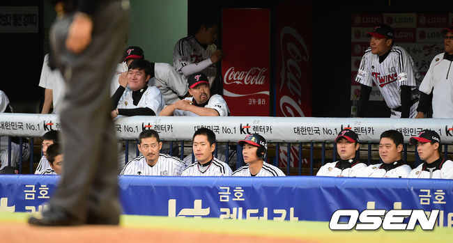 8회말 LG 선수들이 더그아웃에서 경기를 바라보고 있다.