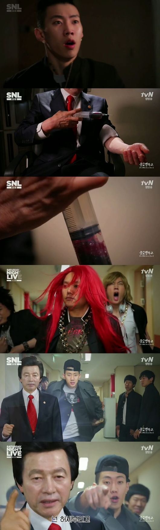 7일 오후 방송된 tvN 'SNL코리아'에서 크루인 박재범은 '중2병 학교'에 출연해 김민교, 권혁수 등과 함께 파격적인 허세 대결로 웃음을 자아냈다.