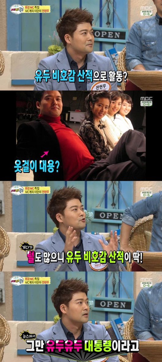 전현무는 "거기에 스트레스를 받다 보니까 인도네시아 대통령 중에 유도유노인데 라디오에서 유두유두 대통령이라고 했다"고 방송사고를 냈던 경험을 털어놔 웃음을 자아냈다.