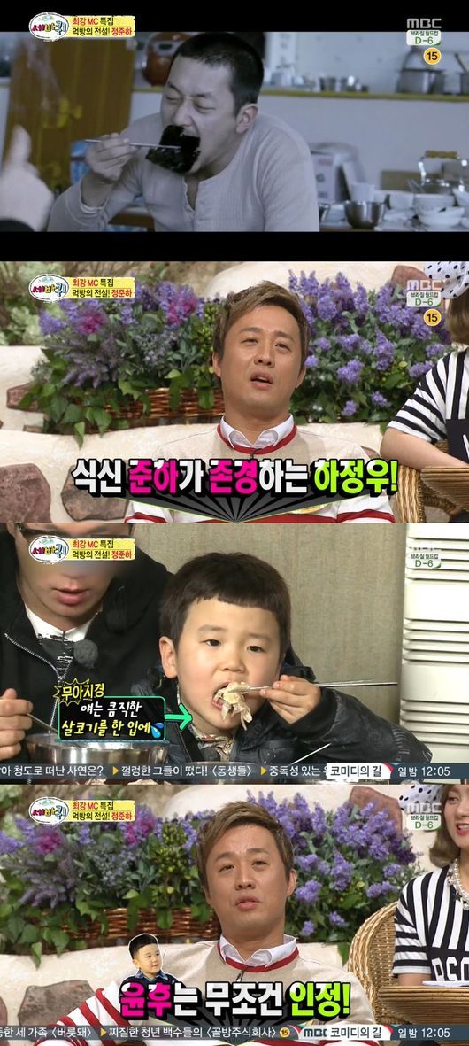 방송인 정준하가 먹방 스타로 인정하는 스타로 배우 하정우와 가수 윤민수의 아들 윤후를 꼽았다.