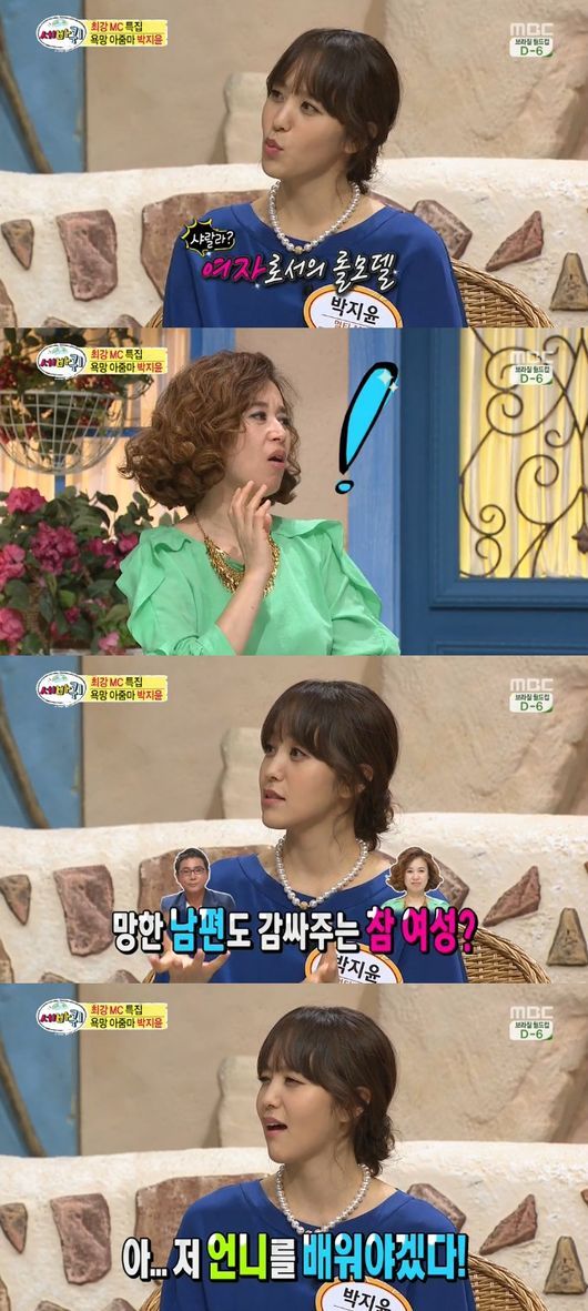 박지윤은 "박미선이 여자로서 롤모델이다"며 "주부로서 역할을 하면서 남편 이봉원 씨가 사업에 실패한 것도 말하고 치켜 세워지는 걸 보면서 저 언니를 배워야겠다고 생각했다"고 말했다.