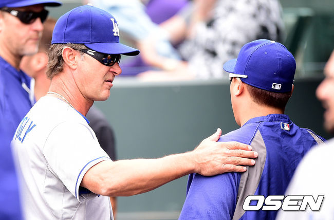 8일 새벽(한국시간) 미국 콜로라도주 덴버 쿠어스필드에서 열린 '2014 메이저리그' 미국 메이저리그 콜로라도 로키스와 LA 다저스의 경기에 앞서 돈 매팅리 감독과 류현진이 이야기를 나누고 있다.