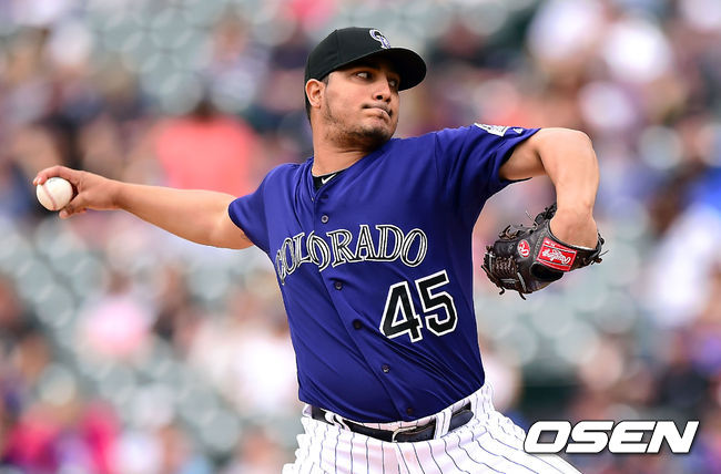 8일 새벽(한국시간) 미국 콜로라도주 덴버 쿠어스필드에서 열린 '2014 메이저리그' 미국 메이저리그 콜로라도 로키스와 LA 다저스의 경기, 1회초 콜로라도 줄리스 샤신이 역투하고 있다.