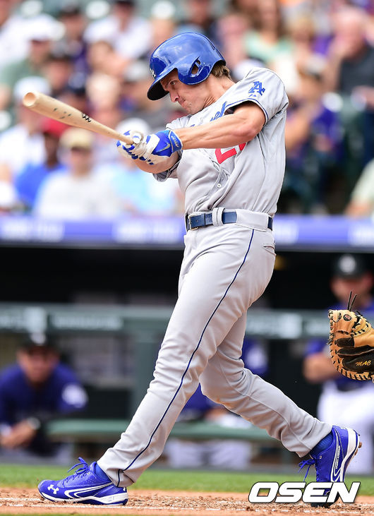 8일 새벽(한국시간) 미국 콜로라도주 덴버 쿠어스필드에서 열린 '2014 메이저리그' 미국 메이저리그 콜로라도 로키스와 LA 다저스의 경기, 3회초 2사 LA 다저스 잭 크레인키가 2루타를 때리고 있다.