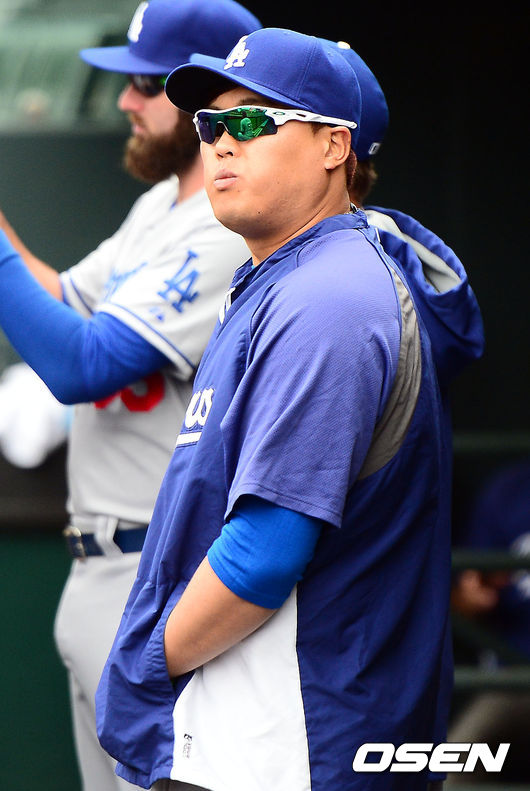 8일 새벽(한국시간) 미국 콜로라도주 덴버 쿠어스필드에서 열린 '2014 메이저리그' 미국 메이저리그 콜로라도 로키스와 LA 다저스의 경기, 류현진이 더그아웃에서 경기를 관전하고 있다.