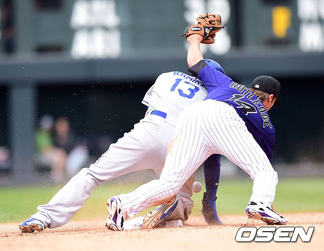 8일 새벽(한국시간) 미국 콜로라도주 덴버 쿠어스필드에서 열린 '2014 메이저리그' 미국 메이저리그 콜로라도 로키스와 LA 다저스의 경기, 7회초 2사 1루 다저스 라미레즈가 2루 도루에 성공하고 있다.