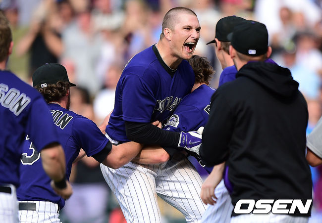 연장 10회말 2사 1루 콜로라도 브랜든 반스가 끝내기 안타를 때린 뒤 동료들과 기뻐하고 있다./youngrae@osen.co.kr