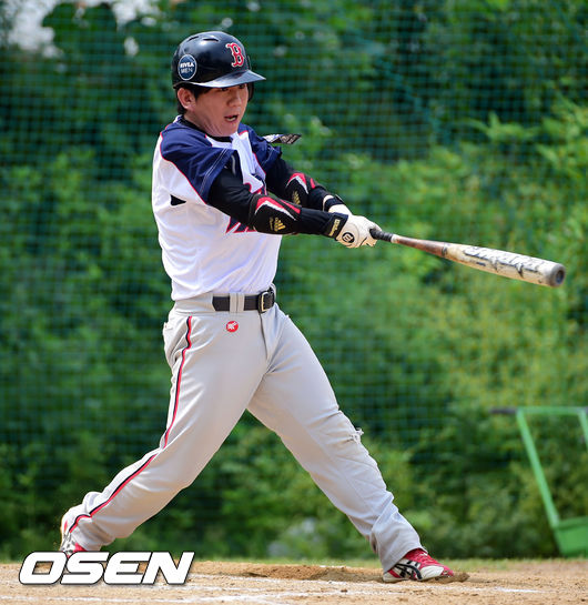 8일 경기도 양평군 오건면 신복리 양평구장에서 진행된 '제5회 니베아맨 컵 전국 생활체육인 야구대회' club bullets(클럽 불레츠)와 심우스틸야구단의 경기, 1회초 무사 3루 클럽 불레츠 권혁환이 선취 1타점 적시타를 날리고 있다.