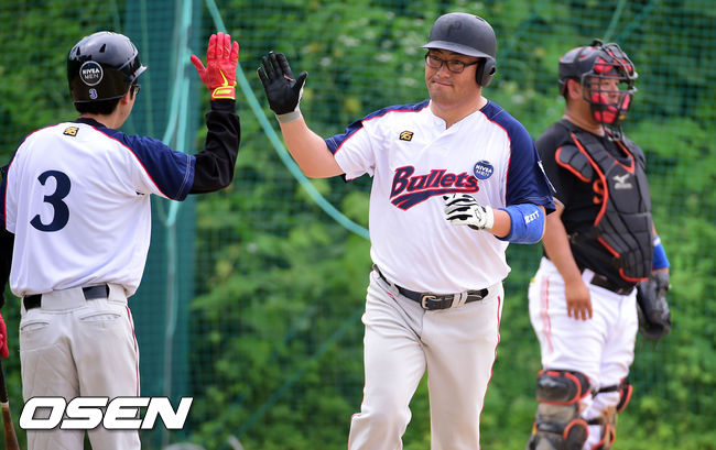 8일 경기도 양평군 오건면 신복리 양평구장에서 진행된 '제5회 니베아맨 컵 전국 생활체육인 야구대회' club bullets(클럽 불레츠)와 심우스틸야구단의 경기, 2회초 클럽 불레츠 김정현이 연속타자 홈런을 날리고 동료들의 축하를 받고 있다.