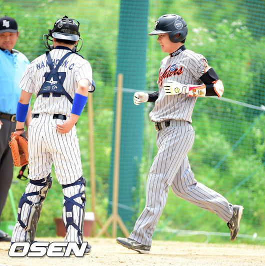 8일 경기도 양평군 오건면 신복리 양평구장에서 진행된 '제5회 니베아맨 컵 전국 생활체육인 야구대회' 아이언 슬러거와 풍산 화이터스의 경기, 1회말 1사 1루 풍산 김정민이 선취 2점 홈런을 날리고 홈을 밟고 있다.